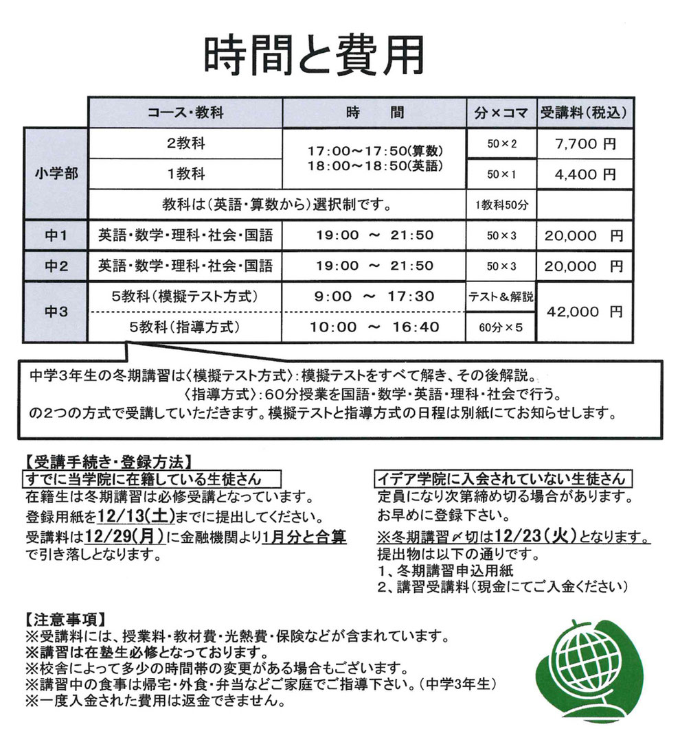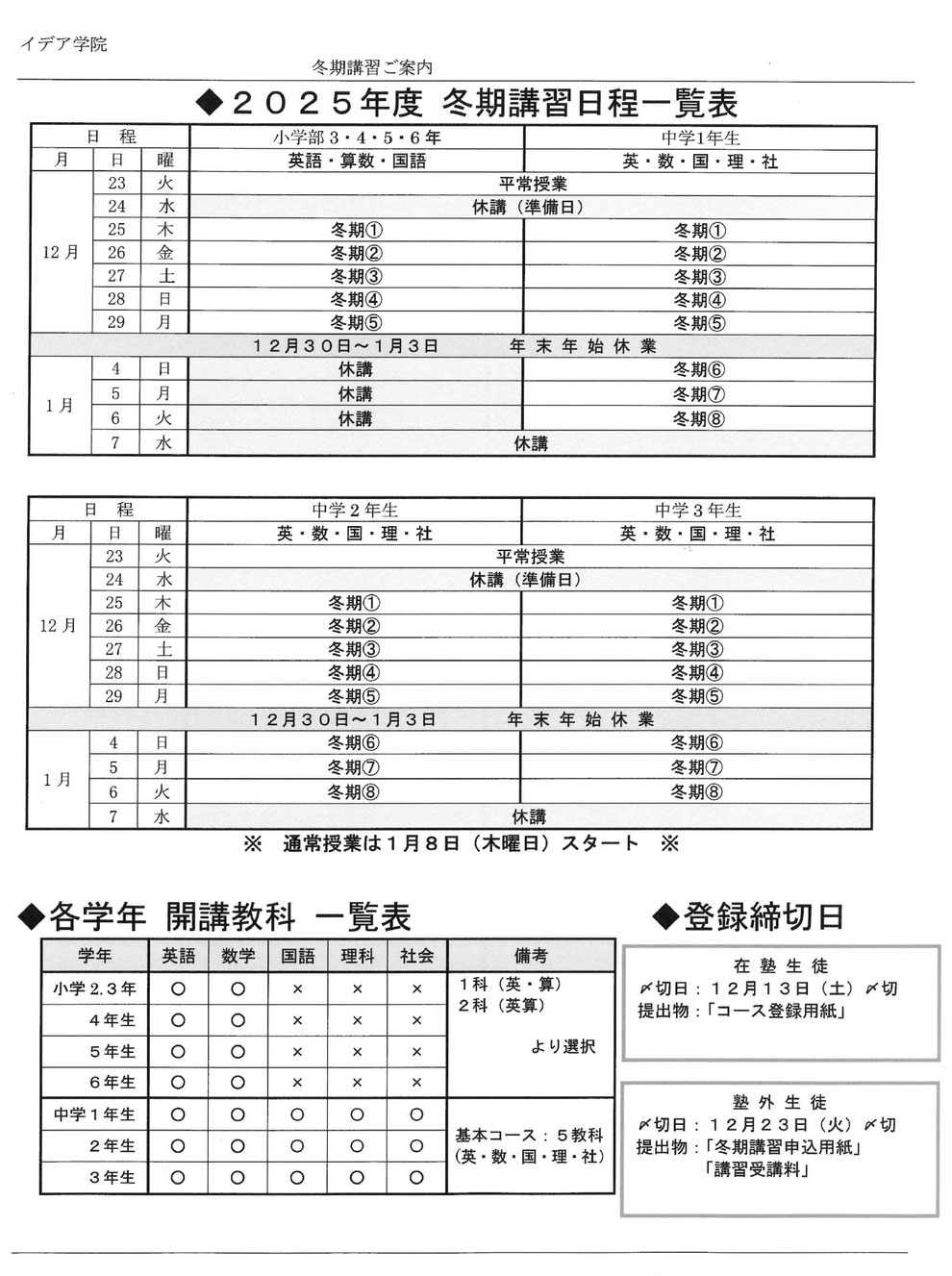 イデア学院では2025年12月25日(木)から冬期講習が開始されます。